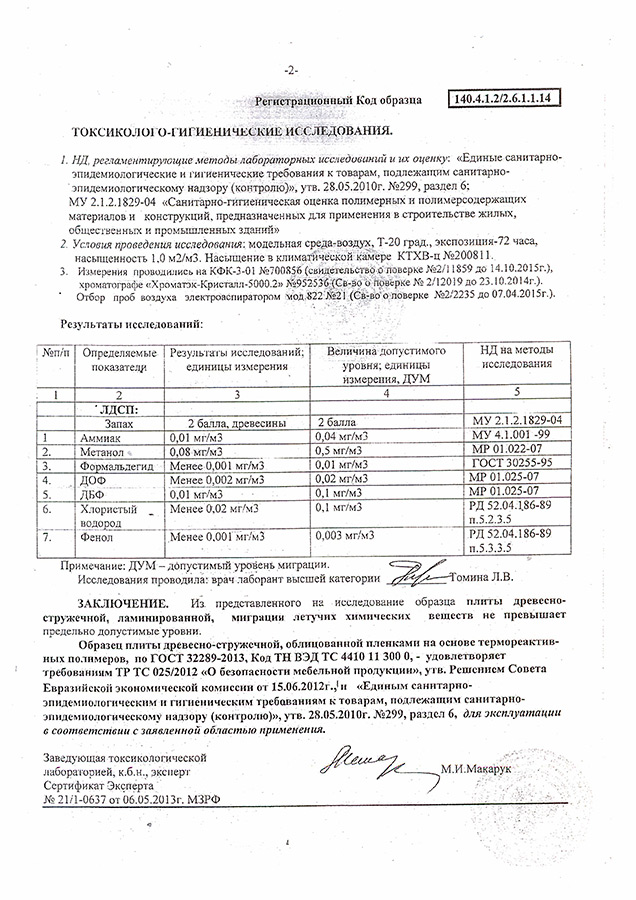 Санитарно-эпидемиологическое заключение на продукцию "ЛДСП ( мебель )" 10.